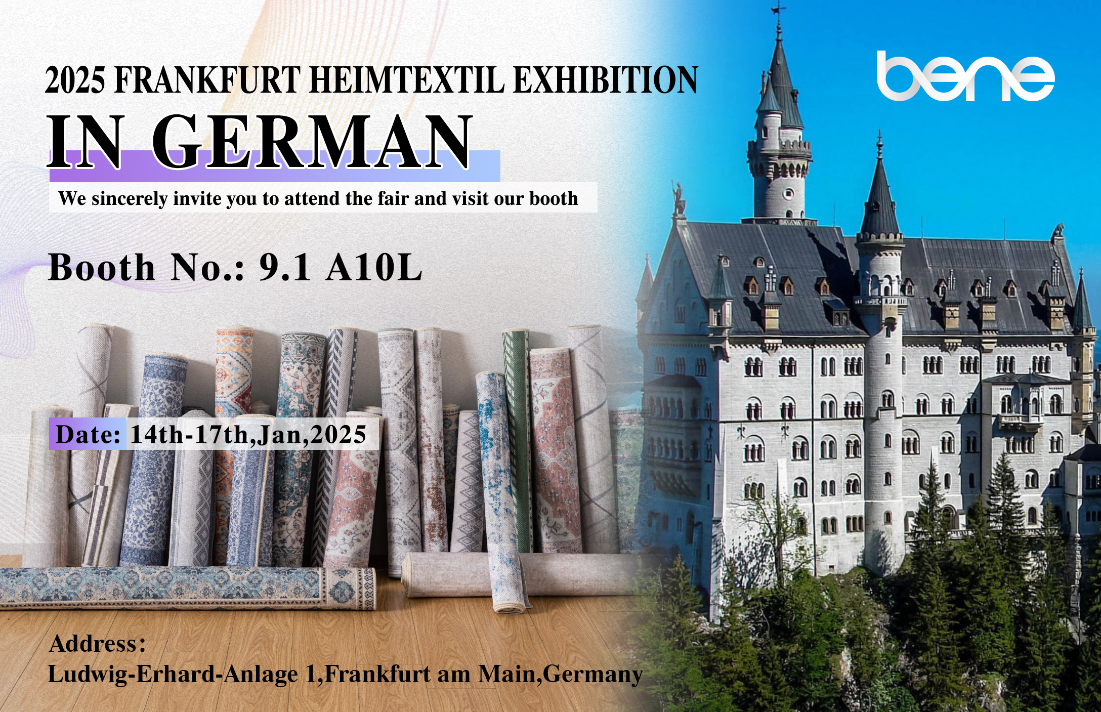 Benyi Textileでは、「革新、持続可能性、品質」の哲学を遵守し、世界の顧客に最高のカーペットとホームテキスタイルソリューションを提供しようと努めています。 2025年のFrankfurt Heimtextilの展示会は、あなたが私たちの最新の製品と技術を発見する絶好の機会であり、私たちはあなたの訪問を熱心に楽しみにしています。