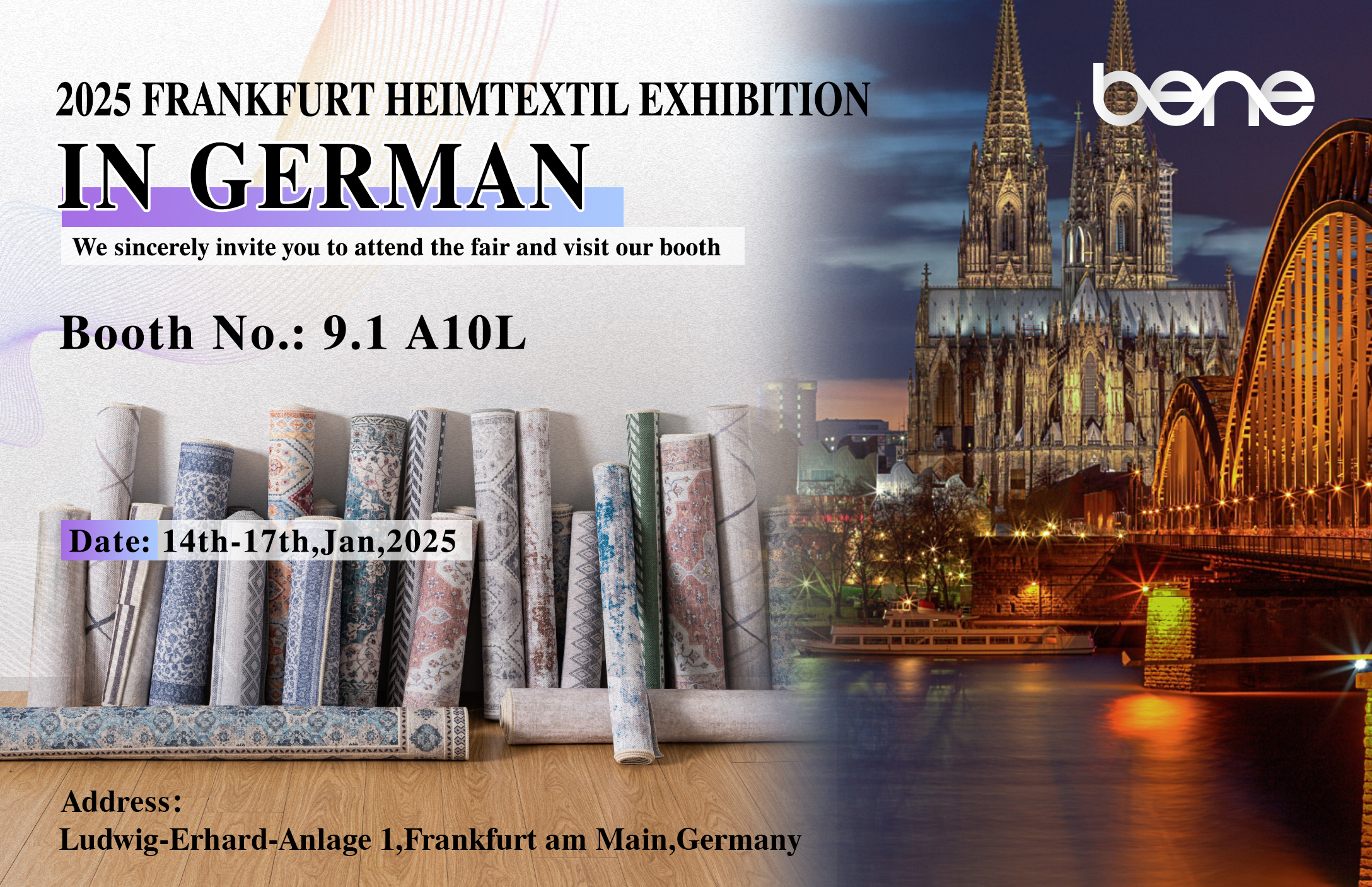 大手革新的なテキスタイルエンタープライズであるZhejiang Benyi Textile Technology Co.、Ltd。は、2025年のFrankfurt Heimtextilの展示会への参加を発表して光栄です。展覧会は2025年1月14日から17日まで開催され、ブースNo. 9.1A10Lで最新のカーペット、ラグファブリック、完成品を紹介します。ブースに訪れ、革新的なテキスタイルテクノロジーと業界のトレンドについて話し合うように心から招待します。